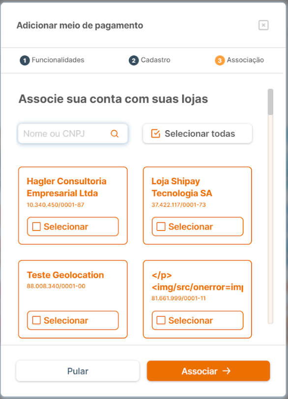 Sendo possível selecionar uma ou mais lojas para associação; buscar pelo nome ou CNPJ da loja que deseja associar, como mostra a imagem abaixo. Para prosseguir clique em “Associar”: