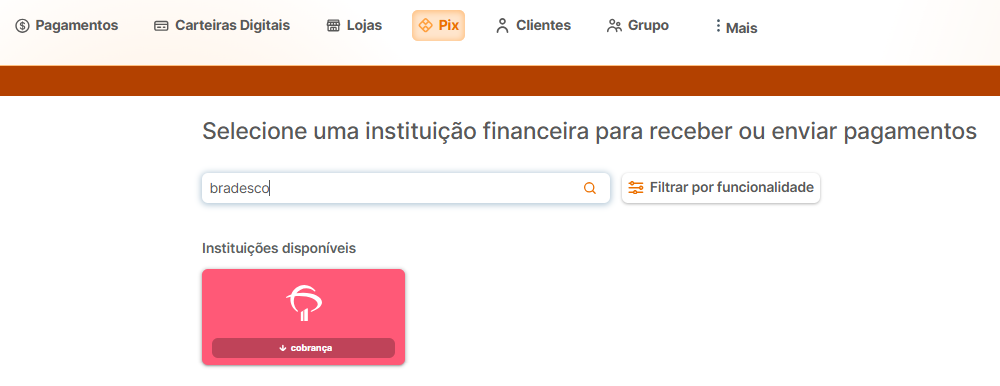 Agora com a chave PIX em mãos basta acessar o Painel Conexão, na aba “PIX” e procurar pelo card do “Bradesco” dessa forma: