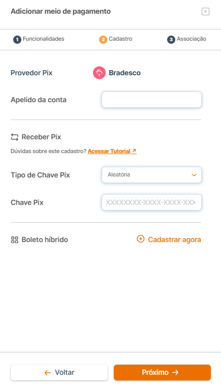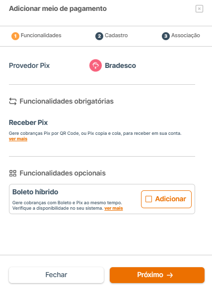 Clicando na opção Bradesco, Para seguir com o cadastro da carteira PIX, selecione “próximo”